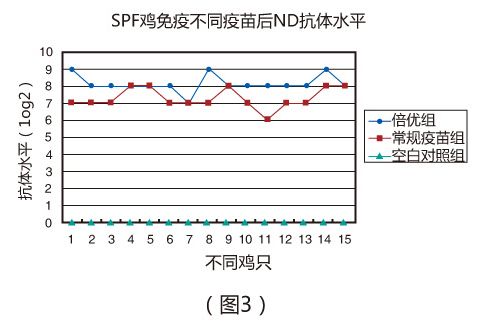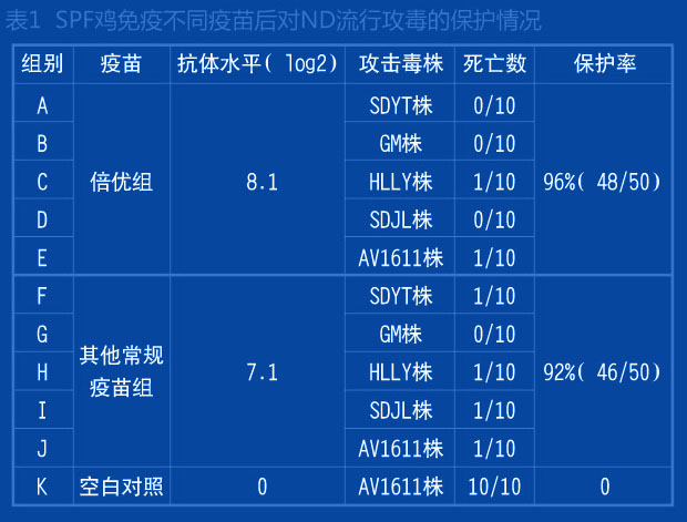 在實驗室條件下,SPF雞7日齡一次免疫倍優(yōu)系列產(chǎn)品(ND+H9 ) 0.1ml ,免疫后21天采用各地分離的流行ND毒株(基因VII型)進(jìn)行攻毒, 倍優(yōu)組的攻毒保護(hù)為96%(表1)。