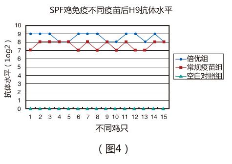 (一)在實驗室條件下,SPF雞7日齡一次免疫倍優(yōu)?系列產(chǎn)品(ND + H9 ) 0.1ml ,免疫后21天,倍優(yōu)組ND和H9抗 體分別達(dá)到8.1log2 (圖3 )和8.6log2 (圖4 );常規(guī)疫苗組ND和H9抗體分別僅為7.3log2 (圖3 )和7.6log2 (圖4)。
