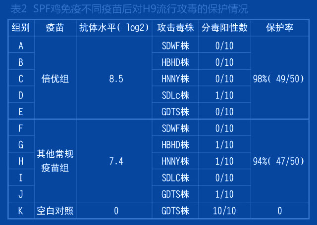 在實驗室條件下,SPF雞7日齡一次免疫倍優(yōu)TM系列產(chǎn)品(ND+H9 ) 0.1ml,免疫后21天采用各地分離的流行H9毒株行攻毒,倍優(yōu)組的攻毒保 護(hù)為98% (表2)。