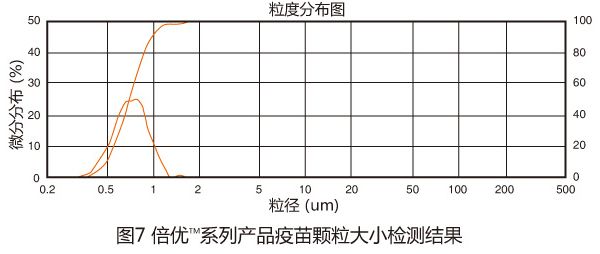 倍優(yōu)?系列產(chǎn)品每一個疫苗毒株均單獨接種雞胚,分別采毒后經(jīng)超高超微分離濃縮后再純化,高度去除雞胚尿棄液中的尿酸鹽、脂多糖等雜質(zhì),經(jīng)過高度純化和超高濃縮后,在進(jìn)行抗體復(fù)配,確保抗原成分單一,從而保證乳化后的疫苗顆粒大小適中、均勻,有效刺激機體產(chǎn)生高而待久的抗體水平;倍優(yōu)?系列產(chǎn)品疫苗顆粒大小0.5~0.6μm ,該大小顆粒占95%以上(圖7)。
