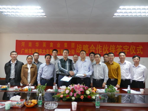 2014年3月28日下午4:30,河南華英禽業(yè)集團(tuán)與廣州市華南農(nóng)大生物藥品有限公司(以下簡稱“華南生物”)戰(zhàn)略合作簽約儀式在華南生物公司會議室舉行。河南華英禽業(yè)集團(tuán)常務(wù)副總經(jīng)理張家明、種鴨部副總經(jīng)理余廣敏、生產(chǎn)技術(shù)部技術(shù)經(jīng)理龔加根,華南生物公司梁昭平總經(jīng)理等有關(guān)負(fù)責(zé)人參加了簽字儀式。