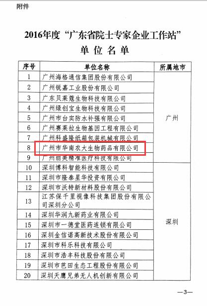 為貫徹落實《中共廣東省委 廣東省人民政府關(guān)于加強新時期科協(xié)工作的意見》(粵發(fā)[2013]2號)精神,充分發(fā)揮科協(xié)系統(tǒng)的組織網(wǎng)絡(luò)、人才智力和科學(xué)技術(shù)優(yōu)勢,進(jìn)一步加快實施創(chuàng)新驅(qū)動發(fā)展戰(zhàn)略,將院士、專家等高端人才引入企業(yè),幫助企業(yè)解決技術(shù)難題,培養(yǎng)科技創(chuàng)新人才,促進(jìn)產(chǎn)學(xué)研合作,提高企業(yè)核心競爭力,依據(jù)《廣東省“院士專家企業(yè)工作站”管理辦法(試行)》的規(guī)定,經(jīng)有關(guān)單位申請、地方科協(xié)推薦、實地考察調(diào)研,省科協(xié)決定在廣州市華南農(nóng)大生物藥品有限公司等44家單位建立“廣東省院士專家企業(yè)工作站”。建站期為2016年12月至2019年12月。