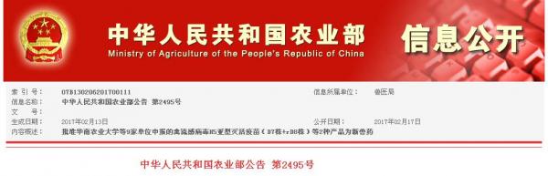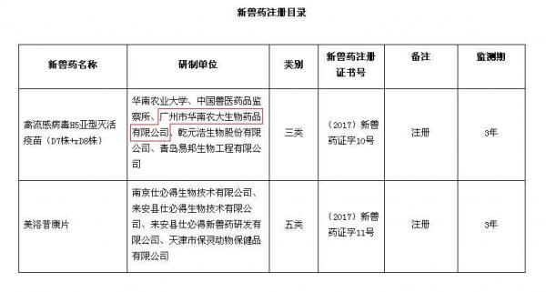 根據《獸藥管理條例》和《獸藥注冊辦法》規定,經審查,批準華南農業大學等9家單位申報的禽流感病毒H5亞型滅活疫苗(D7株+rD8株)等2種產品為新獸藥,核發《新獸藥注冊證書》,并發布產品試行規程、質量標準、說明書和標簽,自發布之日起執行。