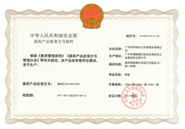 2017年8月14日,由華南農業大學、中國獸醫藥品監察所、廣州市華南農大生物藥品有限公司(以下簡稱“華南生物”)共同研發的禽流感病毒H5亞型滅活疫苗(D7株+rD8株)通過農業部獸藥產品批準文號的審批,喜獲得農業部核發的獸藥產品批準文號——獸藥生字190912293;商品名:禽盾。