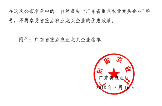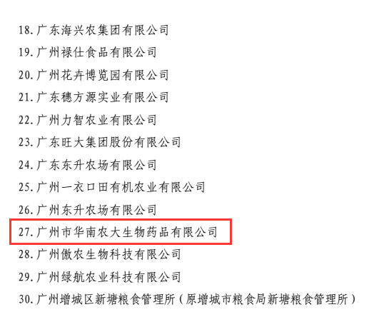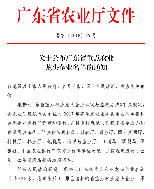 近日,廣東省農業廳下發粵農【2018】49號文件關于公布廣東省重點農業龍頭企業名單的通知,廣州市華南農大生物藥品有限公司晉升為廣東省重點農業龍頭企業,此次廣東省有820家企業獲此殊榮,其中廣州市企業有30家。