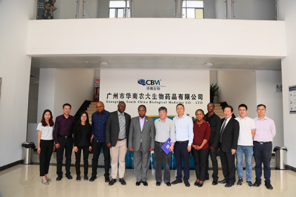 11月8日,肯尼亞內羅畢大學團隊在廣州謝諾中非投資管理有限公司魏曉林執行總裁的陪同下到廣州市華南農大生物藥品有限公司(以下簡稱華南生物)進行參觀交流。