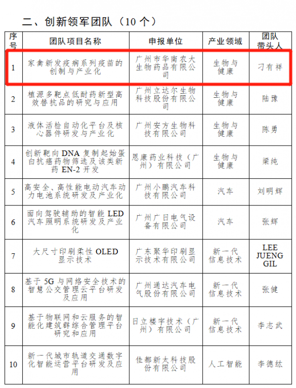 5月23日,2019年度廣州市產業領軍人才重點項目擬入選人員(團隊)公示,按照關于加快集聚產業領軍人才的意見相關規定,經申報評審各項程序,廣州市華南農大生物藥品有限公司擬入選“2019年度廣州市創新領軍團隊”。