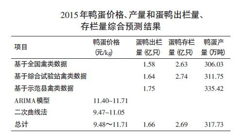 基于三種數據來源(全國禽類數據、12個蛋鴨主產省區禽類數據和示范縣禽類數據)采用比例調整法對蛋鴨出欄量和鴨蛋產量進行了推算,預測出2015 年蛋鴨出欄量為1.66億只,與2013年相比增加20.29%,產蛋量為317.73萬噸,與2013年相比略有下降,下降幅度為5.92%;基于兩種數據來源(全國禽類數據、12個蛋鴨主產省份禽類數據)對蛋鴨存欄量進行了預測,預測出2015年蛋鴨存欄量為2.69億只,與2013年相比增加39.38%;采取兩種方法(ARIMA模型和二次曲線法)對鴨蛋價格進行了預測,根據兩者預測結果匯總得出,2014年底至2015年初,每千克鴨蛋價格將維持在9.47元~11.71元之間,在節假日會有小幅上漲,與2013年相比基本無變化。