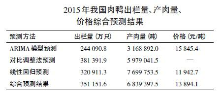 由于2013年受人感染H7N9流感事件的沖擊而價格和生產量均有所下降,進入2014年一直處于反彈增長趨勢,而且這一趨勢還會在2015年持續一段時期,因此,根據3種預測方法綜合預測:2015年肉鴨的出欄量為35.1152億只,較2013年增長14.55%;產肉量683.94萬噸,較2013年增長9.02%;白條鴨價格為13 894.1 元/噸,較2013年增長5.82%,在11 942.7~15 845.4元/噸波動。根據預測結果分析,2015年肉鴨產業將呈現平穩增長的態勢。