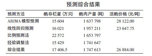 采用4種方法預測2014年鵝存欄量、鵝肉產量,以及2種方法預測2014年的活鵝價格(見表)。根據4種方法計算出的2014年鵝存欄量的平均值為17 406.5萬只,鵝肉產量為1747 613噸,鵝價格為26 884元/噸。另外,參照揚州大學徐琪根據我國鵝品種統計的鵝年存欄量21195萬只,可以估算出2014 年我國鵝年存欄量將處在1.7億~2.1億只之間。因此,上述綜合預測結果是可信的。