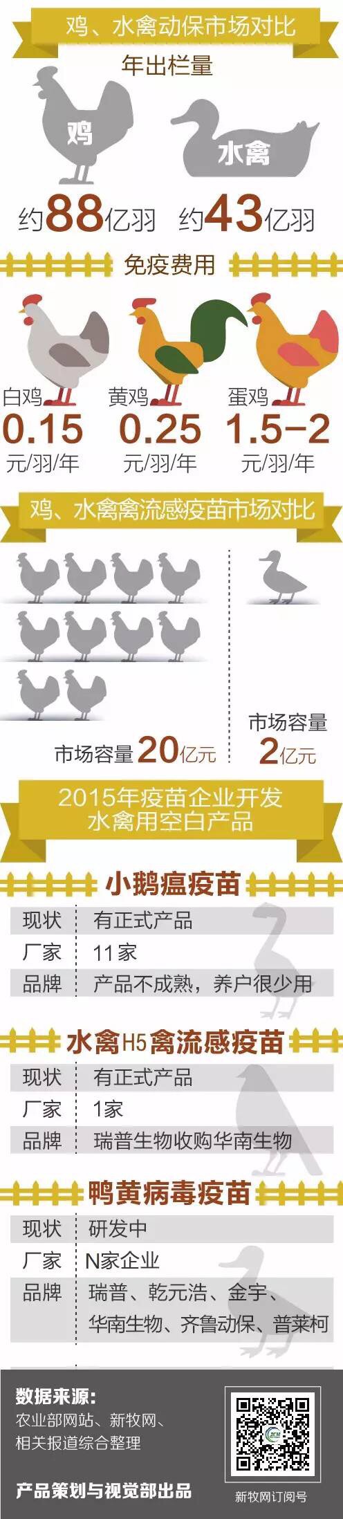 近幾年,隨著養雞產業和雞用疫苗產業的日趨成熟,水禽產業逐漸成為動保企業新的利益挖掘點。多家動保企業摩拳擦掌,試圖搶占水禽動保市場的發展先機。僅以絕大多數水禽均需免疫的H5亞型禽流感滅活苗(水禽專用)評估,國內市場每年的需求量便已超20億羽份。盡管目前H9亞型禽流感滅活苗、鴨傳染性漿膜炎疫苗等仍未處于水禽“必須免疫”的疫苗之列,但隨著水禽產業規模化、標準化程度提高,水禽疫苗市場將進一步擴大。