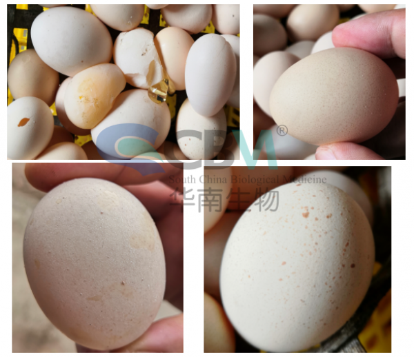 患雞吐口水,拉飼料便,逐漸消瘦;產(chǎn)蛋率下降,種蛋受精率下降,孵化后期(18天齡)死胚增多,孵出弱雛增多,死亡增多;種蛋大小不一,蛋殼質(zhì)量變差,破殼蛋、軟殼蛋增多,血斑蛋、霉斑蛋增多。