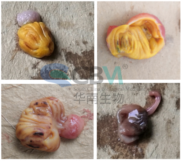 股骨頭壞死,股骨頭軟骨易脫落;嗉囊白色假膜樣粘附物,腺胃腫大,肌胃角質(zhì)層增厚、易裂開脫落,甚至出現(xiàn)明顯潰瘍?cè)睿灰蝗正g弱雛或出殼不全雞雛肌胃呈點(diǎn)狀、線狀、片狀潰瘍;毛蛋和嚴(yán)重呼吸道癥狀雛雞的肺、氣囊中出現(xiàn)霉菌結(jié)節(jié)。