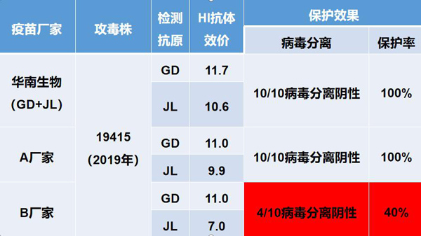 攻毒保護(hù)試驗(yàn)表明,使用華南生物(GD+JL)2019年H9N2疫苗株對(duì)流行毒株的攻毒保護(hù)率均為100%,明顯優(yōu)于其它競(jìng)爭(zhēng)廠家,見下圖: