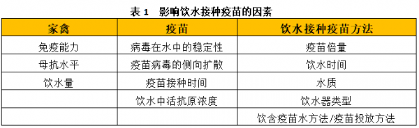 飲水接種疫苗的原則是向所有的家禽至少提供最小保護(hù)劑量的活疫苗,同時(shí)需防止現(xiàn)場(chǎng)野毒在家禽中擴(kuò)散。因此,飲水接種疫苗的效果取決于多種與保持疫苗活性相關(guān)的因素、飲水接種操作方法和家禽健康情況三大類。具體見表1所示,忽略一個(gè)小細(xì)節(jié),都有可能致使疫苗免疫失敗。
