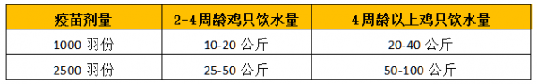 溶解疫苗所需的水量根據(jù)雞群日飲水量而定,大致的標(biāo)準(zhǔn)是:全天飲水量的1/5-2/5,如果是考慮肉雞或天氣炎熱時(shí),飲水量可增加5~10%(參考下表)